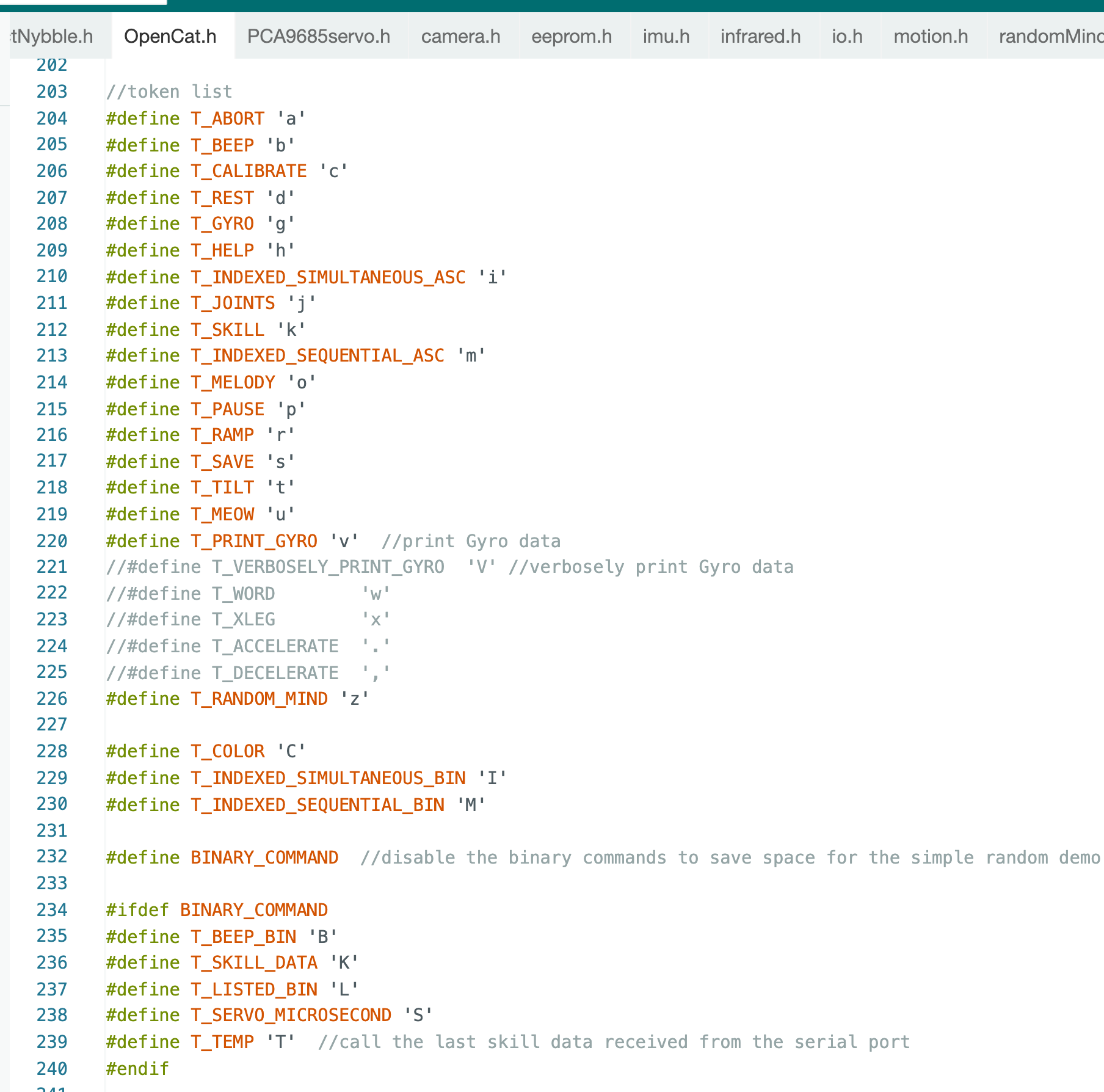{% @github-files/github-code-block url="<https://github.com/PetoiCamp/OpenCat/blob/3368dfd46d91cb453bb5fcca3ca4cf84712c922e/src/OpenCat.h#L204-L254>" %}