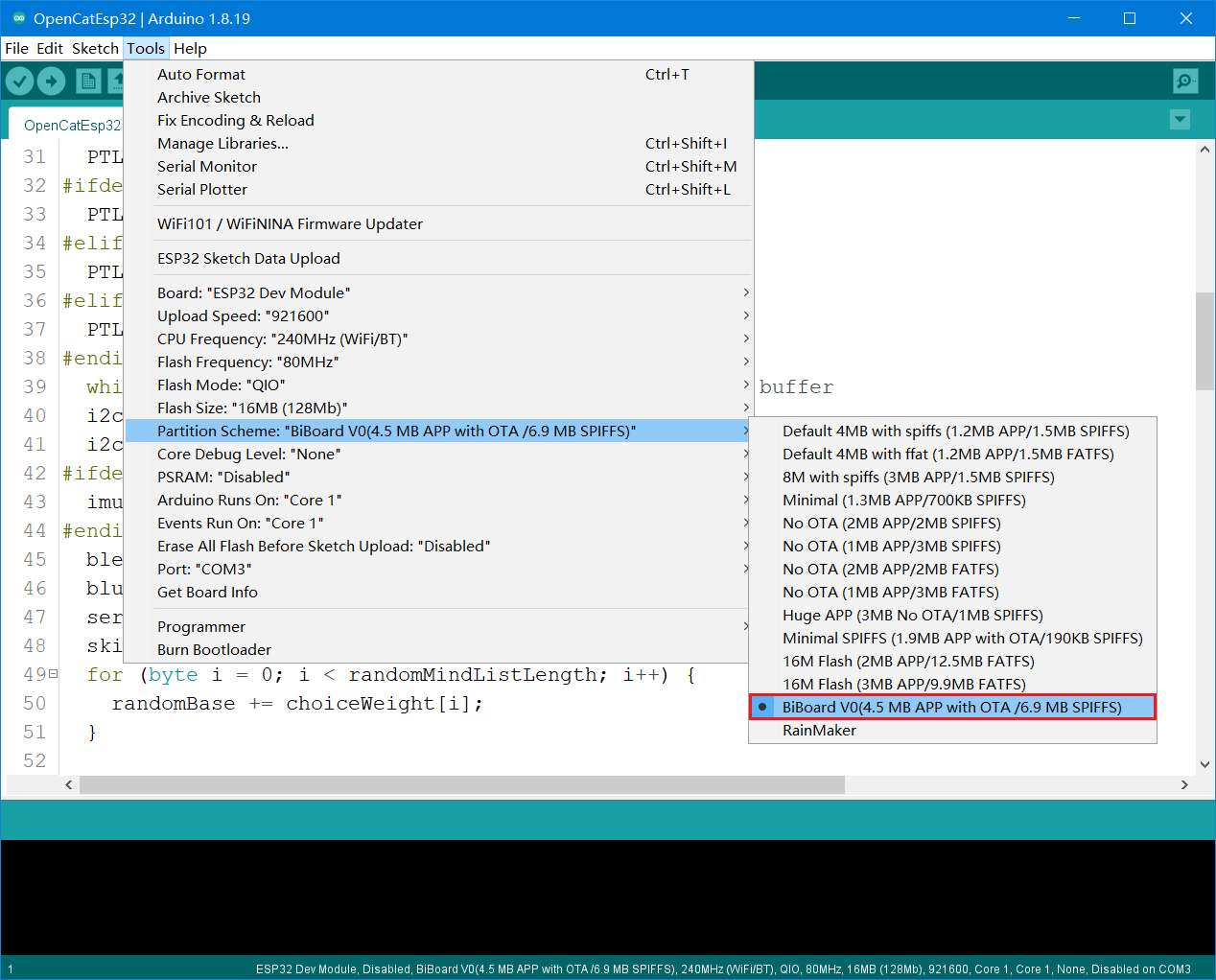 The name of the ESP32 partition configuration, we named it BiBoard V0 (4.5M APP with OTA /6.9 MB SPIFFS), or it can be replaced with other names you are familiar with.