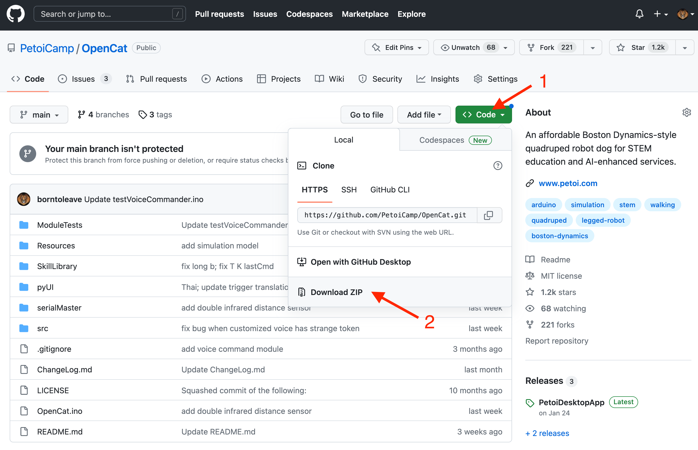 * 从GitHub下载最新的OpenCat代码库：<https://github.com/PetoiCamp/OpenCat>。最好使用GitHub的版本控制功能。否则，请确保您每次都下载全部的OpenCat文件夹。所有代码必须是相同版本时才能一起使用。