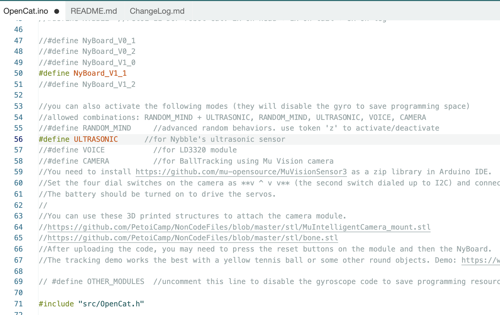 默认程序是标准模式。如果您有一些[扩展模块](https://docs.petoi.com/v/chinese/kuo-zhan-mo-kuai/kuo-zhan-mo-kuai-gai-yao-shuo-ming)，可以将这些模块的宏定义语句取消注释。这样会禁用陀螺仪的代码节省出一些编程空间，并激活这些扩展模块的演示代码。