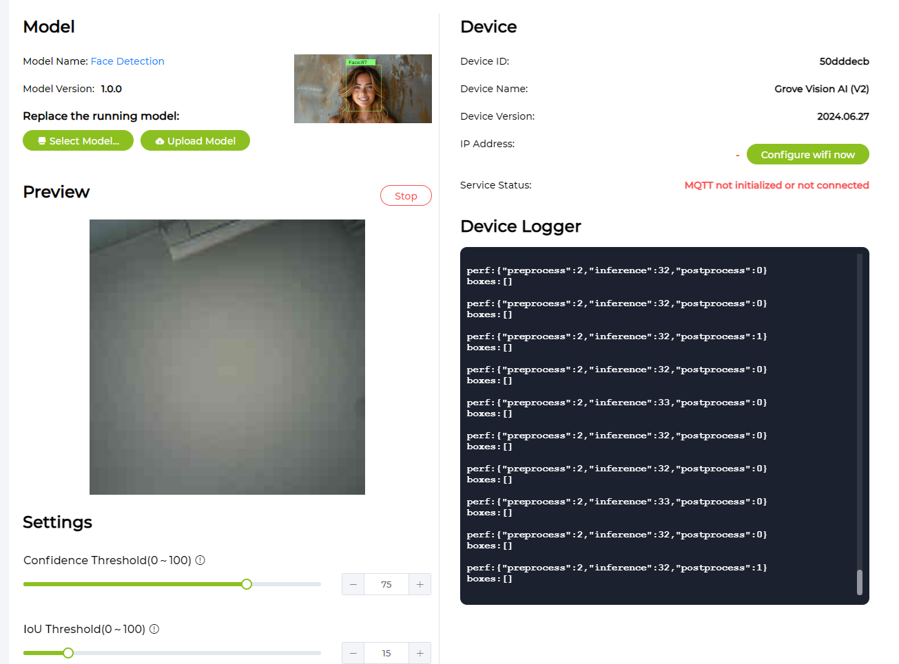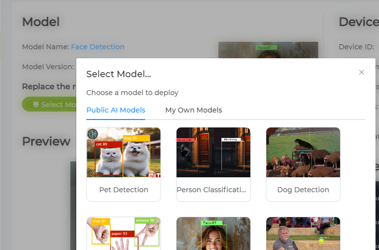 在 "模型 "区域，您可以选择 SenseCraft AI 提供的模型，也可以上传您自己训练的模型。