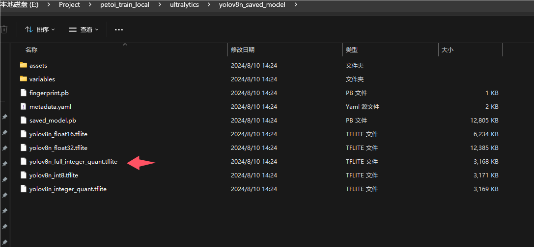 你将会在当前文件夹下看到一个 `yolov8n_saved_model` 文件夹，其中包含 `yolov8n_full_integer_quant.tflite` 模型文件。