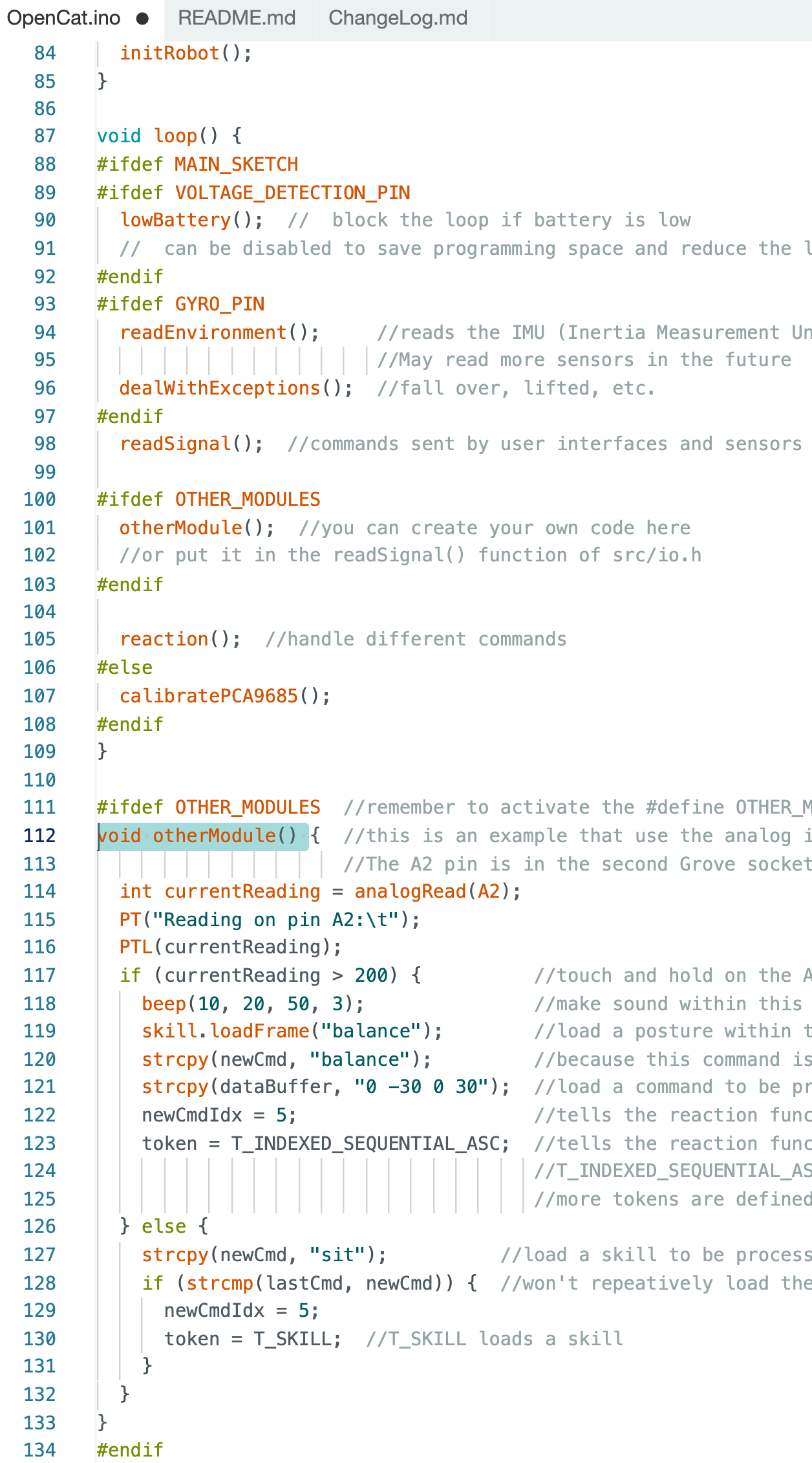 ใน official modules ถูกกำหนดไว้ในไฟล์ส่วนหัวแยกต่างหากใน **OpenCat/src/** คุณสามารถค้นหาได้ใน **OpenCat/src/io.h -> readSignal()** ลักษณะการทำงานของ **OTHER\_MODULES** กำหนดไว้ใน **OpenCat/OpenCat.ino -> otherModule()** คุณสามารถศึกษาโค้ดตัวอย่างเพื่อเขียนฟังก์ชันของคุณเองได้
